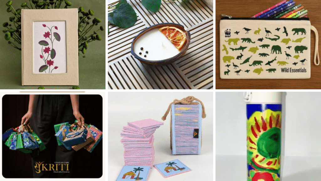 Gulmeher creates eco-friendly gifts from discarded flowers, fabric scraps, and recycled paper, while supporting women who are former waste pickers in Ghazipur. With home décor, stationery, corporate, and festive collections, their products make gifts that are not only beautiful but meaningful too.